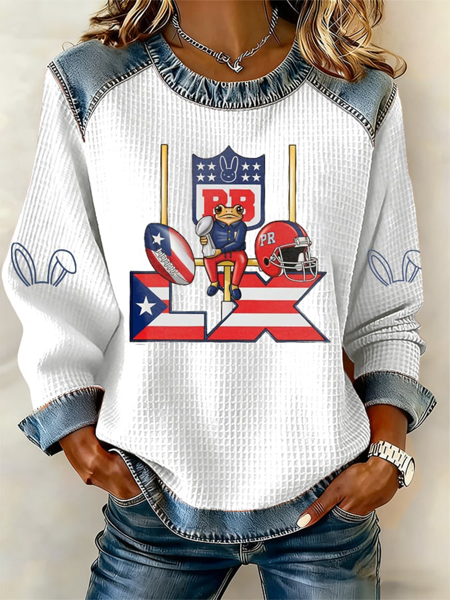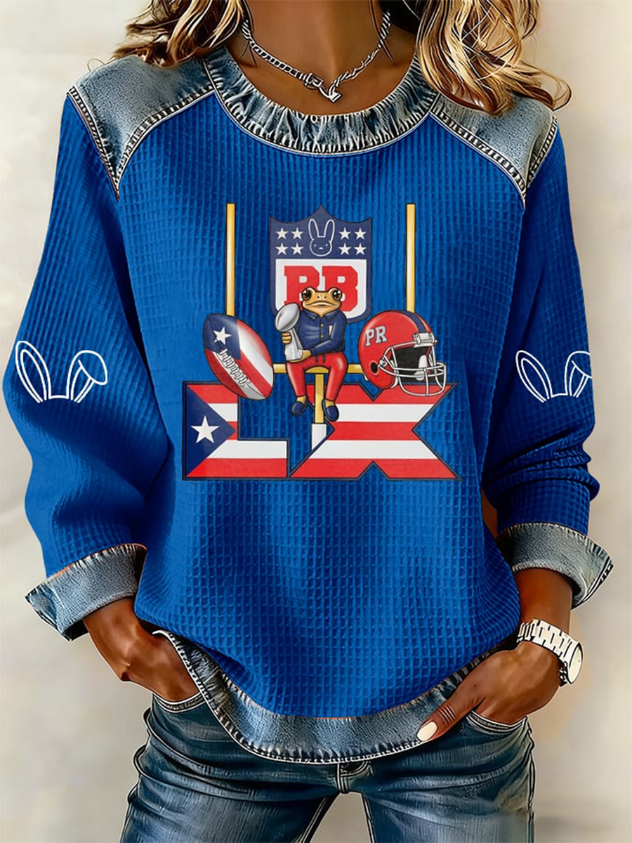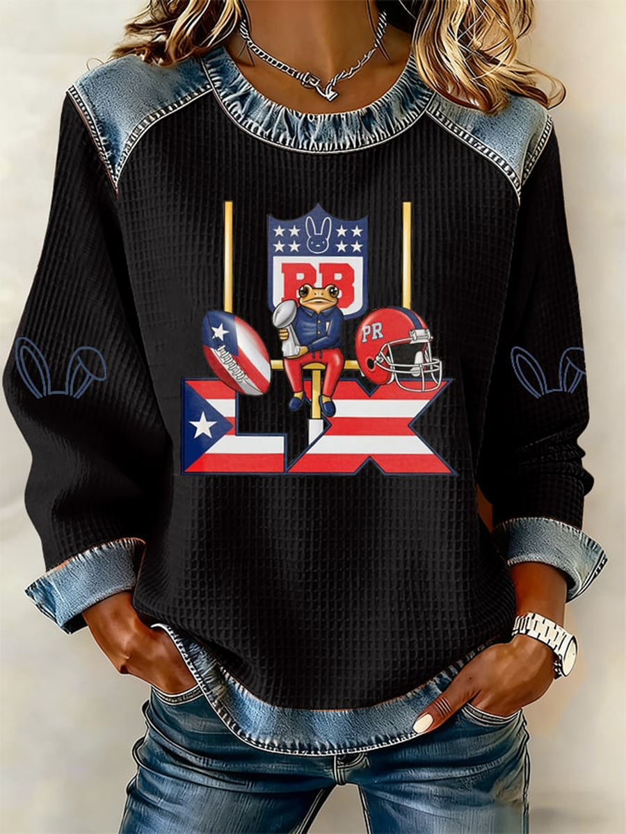 Women's Bunny Football Music Lover Printed Denim Patchwork Top